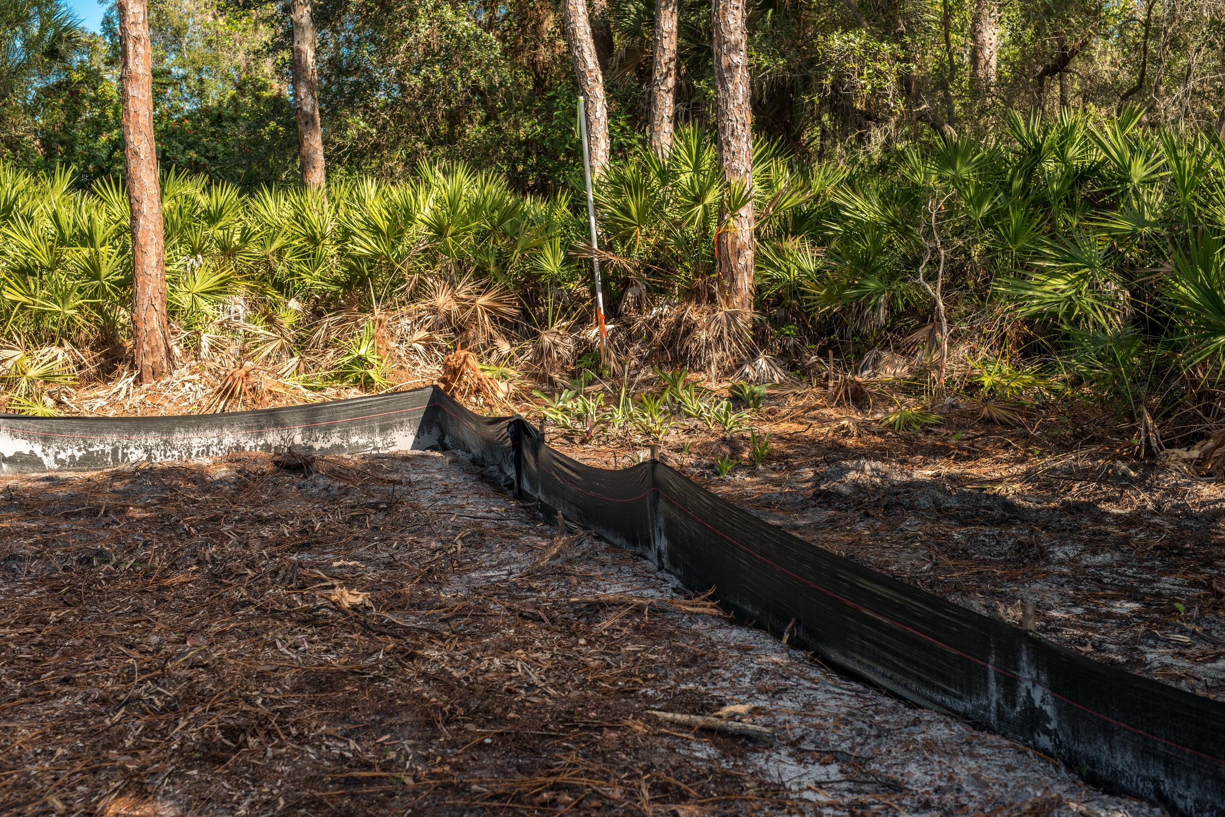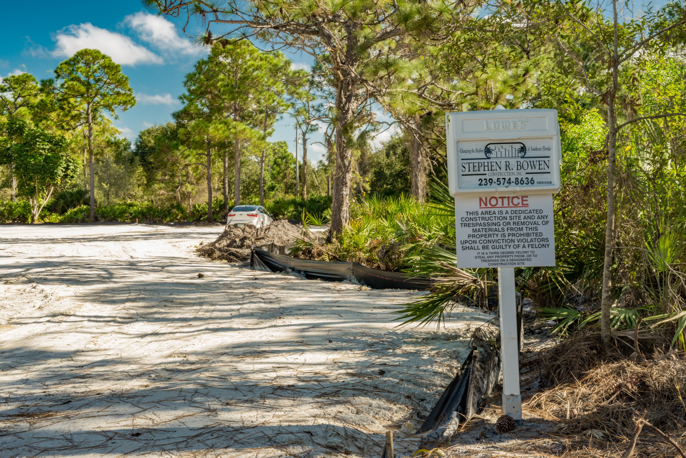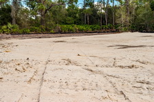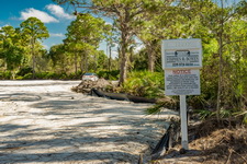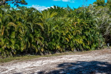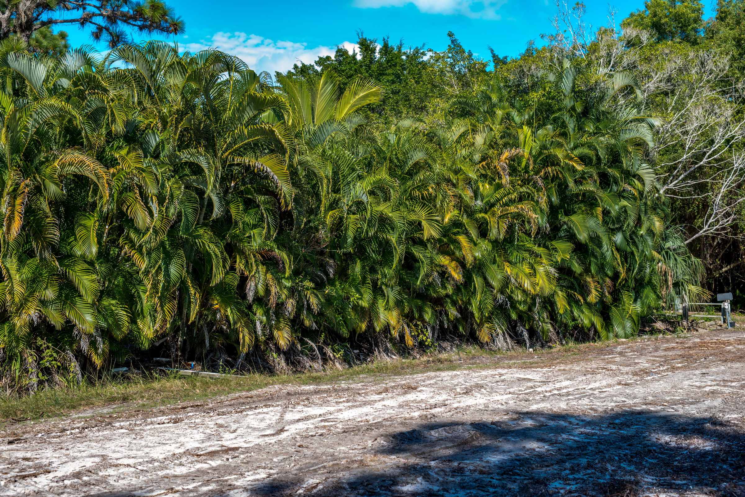 | Bottlebrush Road is still in a bit of trouble from the torrential rains from late 11/15. Driving around Pine Island, I've seen more paved roads than I had been led to expect. I expect it will be decades before this one is paved. | ...and here it is. The site now has a 0.85 acre clearing where I can build a house and still have some room to walk around. | It's cleared! | Across the street, my neighbor uses Areca palms for privacy. I may do something similar though may want a bit more interest. |
