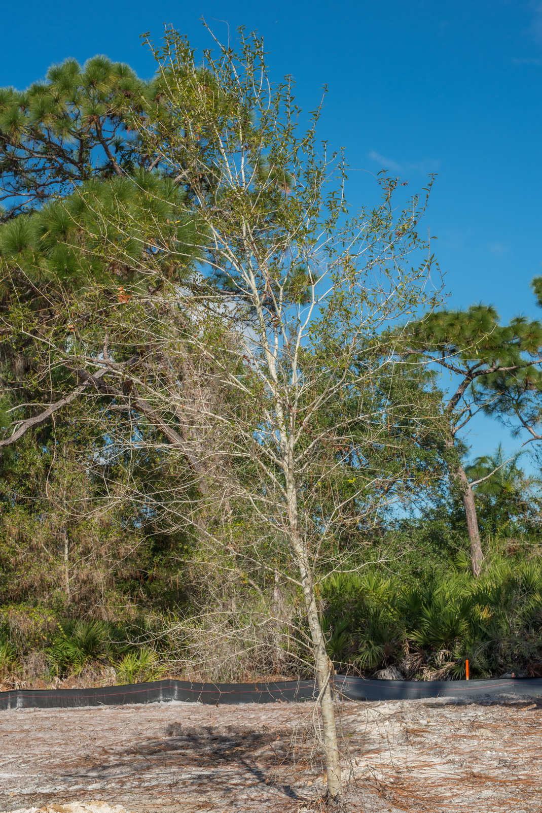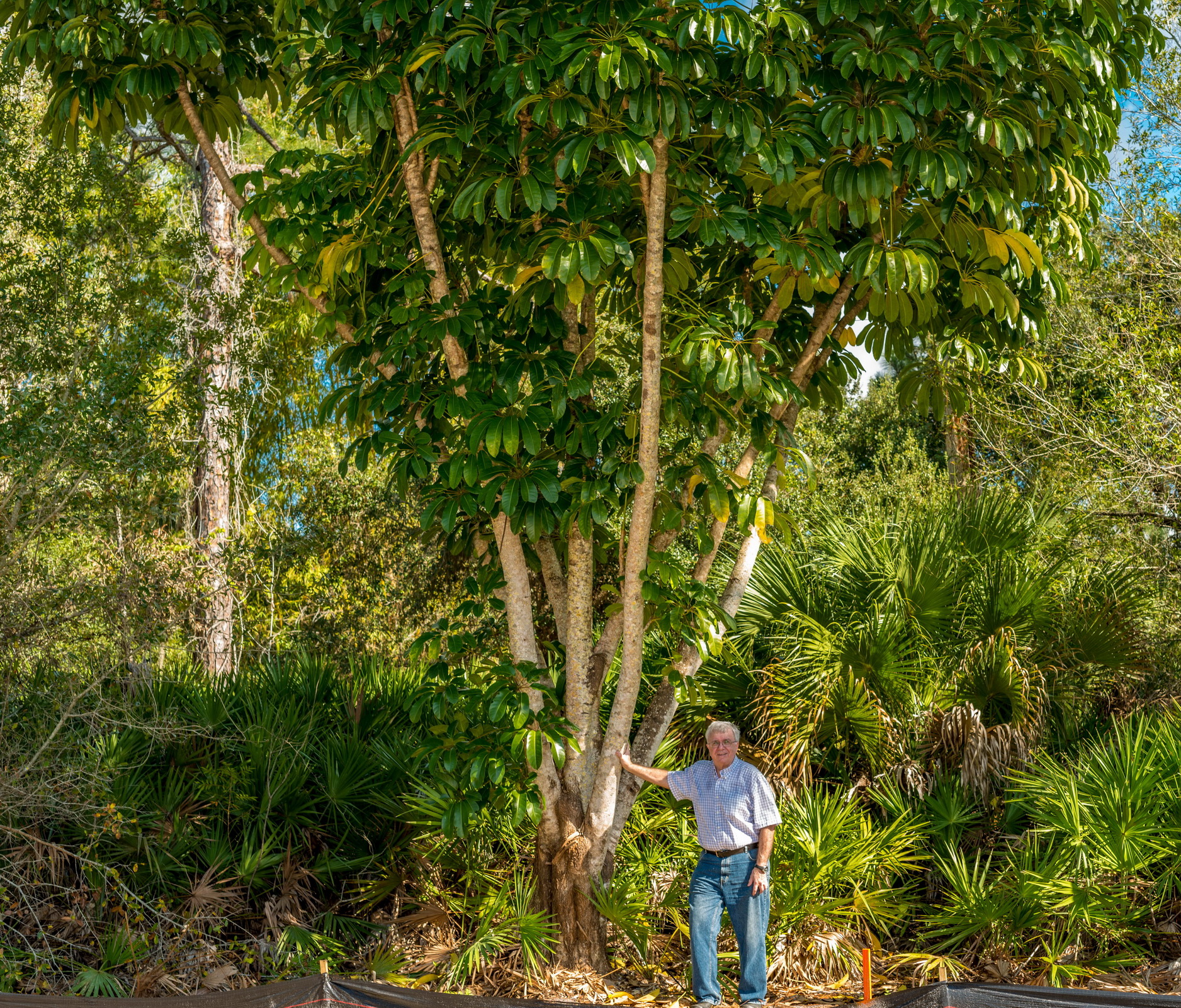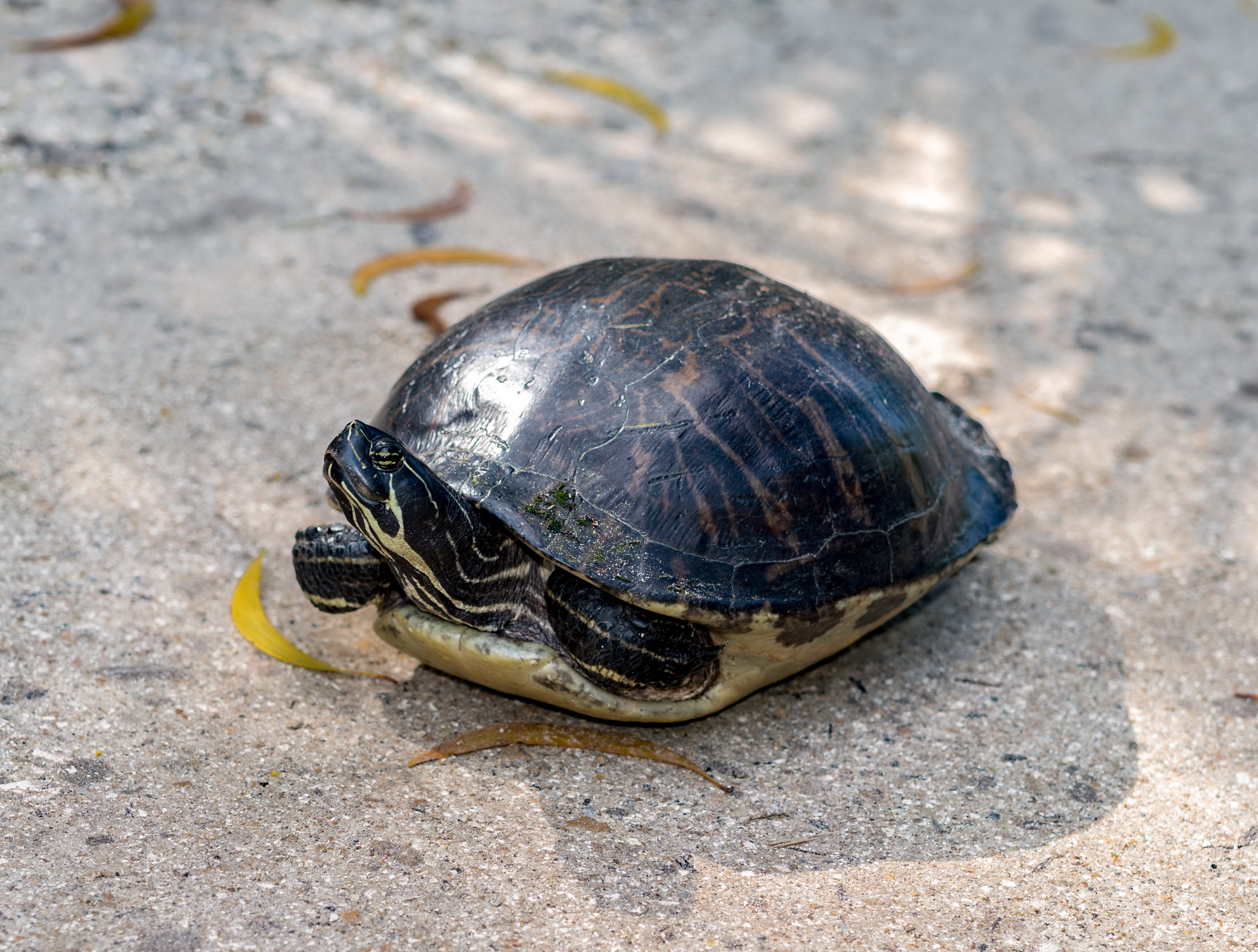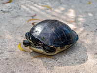| Here's that same Schefflera with me claiming it as mine. After all those years of seeing these tortured in living rooms, it's interesting to see what they can do out in the wild. | If any of my plant friends can identify this tree, I'd appreciate it. It's near the NE corner of what will be the guest apartment. I don't know if it's in a bit of trouble or if this is just a seasonal leaf loss. If it's in trouble, please tell me what I can do. | I had great hopes that leaving Long Islasnd would leave raccoons behind. It appears I'm wrong. I now see poison ivy and raccoons are following me to Pine Island. | This isn't a tortoise but rather is a Florida turtle. This is an "Eastern Chicken Turtle", Deirochelys reticularia. This wasn't inside the tortoise fence but rather out on the road next to my house. It's probably a resident of one of my neighbor's ponds. |